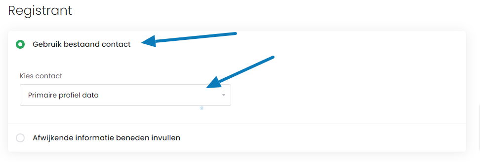 Veld Beschrijving Voorbeeldwaarde Registrant Geeft aan of je het bestaande account contact wil gebruiken. Zo ja, selecteer de gewenste contactpersoon in de Kies Contact drop down lijst. Primaire Profielgegevens Admin Geeft aan of je het bestaande admin contact wil gebruiken. Zo ja, selecteer de gewenste contactpersoon in de Kies Contact drop down lijst. Primaire Profielgegevens Tech Geeft aan of je het bestaande technisch contact wil gebruiken. Zo ja, selecteer de gewenste contactpersoon in de Kies Contact drop down lijst. Primaire Profielgegevens Facturatie Geeft aan of je het bestaande facturatie contact wil gebruiken. Zo ja, selecteer de gewenste contactpersoon in de Kies Contact drop down lijst. Primaire Profielgegevens